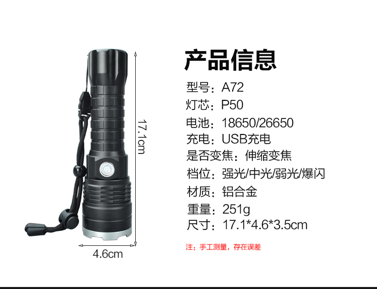 Lanterna LED P50 Recarregável com Zoom